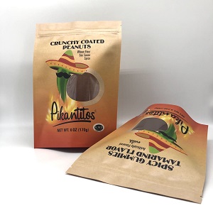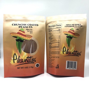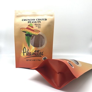 The dimension of the above kraft paper snack packaging bag is 160X230+45X2mm. This size can be loaded with 170g, about 6oz weight of peanuts or nut products in similar size and shape.