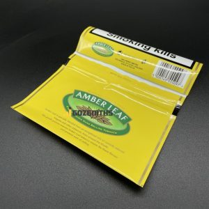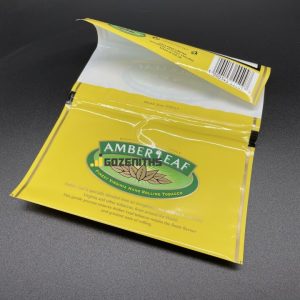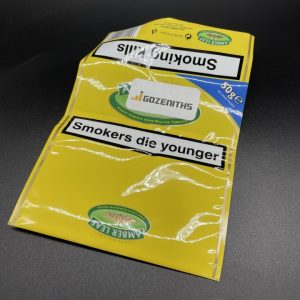 Yellow glossy custom printed tobacco bags containing 50grams tobacco.